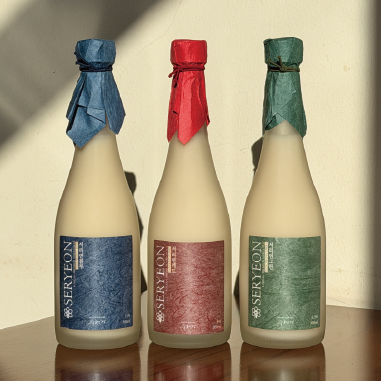 서리연 막걸리는 한국의 전통 양식인 단청에서 색을 착안하여 파랑, 빨강, 초록의 3가지 라인업으로 준비되어 있습니다.